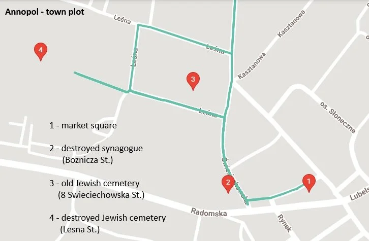 To the north and west of the marketplace stood a synagogue with a Jewish cemetery nearby. The old Jewish cemetery stopped operation in 1792 and was located on Swieciechowska Street. Currently, a health center is at this locale. The new Jewish cemetery in Annopol was established in the 19th century and is situated at Lesna Street. Both cemeteries were destroyed by the Nazis during the war, although a few matzevot remain. Grave stones exist for Aharon Welner, Raizel bas Chaim HaCohen and Chaja Gitel bas Meir (source).