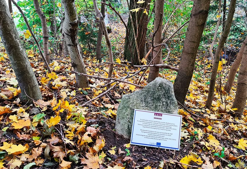 An indication of the location of the New Jewish cemetery in Biskupice. It has no fencing and few gravestones remain.