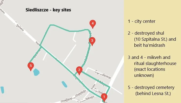 Siedliszcze: The ghetto in Siedliszcze was established on 1 June 1940. The entire Jewish population of the town of about 2,500 people was confined there. The ghetto’s inhabitants worked mainly on land reclamation and to regulate the Mogielanka river for the Wasserwirtschaft Inspektion [German Water Management Board] In April 1942, nearly 3,000 Jews from Czechoslovakia were brought to Siedliszcze. Already in May, they began to be transported to the extermination camp at Sobibor. Separate from these aktions, in 1943, 120 people were murdered in Siedliszcze in 1943. Among the victims were local and Czech Jews as well as Roma and local Polish farmers. The crime was committed by the military policemen from Cyców. The remains of the victims were buried in a cemetery and in a field. From subsequent documents, we learn that the bodies were buried in the Roman Catholic and Jewish cemeteries.