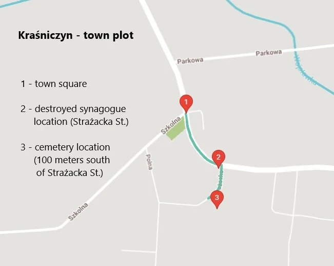 The Jewish cemetery in Kraśniczyn is located on Strażacka Street. It was established in the 1600s and remained in use until the Holocaust. It no longer exists and there are no memorials, markers or indicators that it is present. In May and June of 1942, the local gendarmerie executed 200 Jews at this location. Fragments of eighteen matzevot have survived. Grave markers still exist for Ester Lederman and Ester Warman as well as unknown Szapiro and Yehuda Lejb Segal (source).